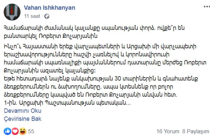 Vahan İşxanyan yazıb ki, Robert Koçaryanın həbsxanada saxlanılmasından kim faydalana bilər?