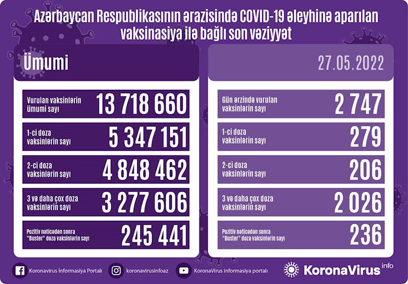 Bildirilib ki, bir gündə birinci mərhələ üzrə vaksinasiya olunanların sayı 279, ikinci mərhələ üzrə vaksinasiya olunanların sayı 206, üç və daha çox doza üzrə vaksinasiya olunanların sayı 2026, pozitiv nəticədən sonra buster doza üzrə vaksinasiya olunanların sayı 236-dır.