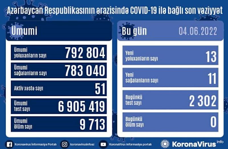 Azərbaycanda koronavirus (COVID-19) infeksiyasına 13 yeni yoluxma faktı qeydə alınıb, 11 nəfər müalicə olunaraq sağalıb.