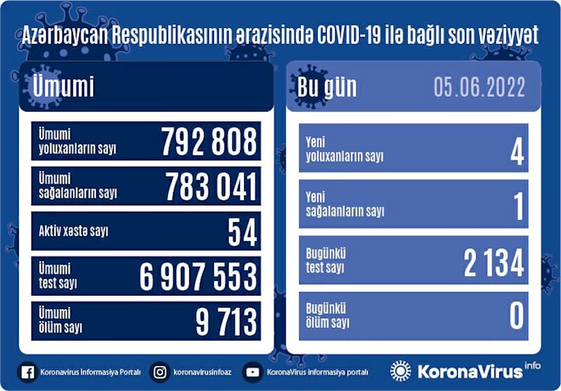 Azərbaycanda bu gün koronavirus infeksiyasına 4 yeni yoluxma faktı qeydə alınıb, 1 nəfər müalicə olunaraq sağalıb və evə buraxılıb.