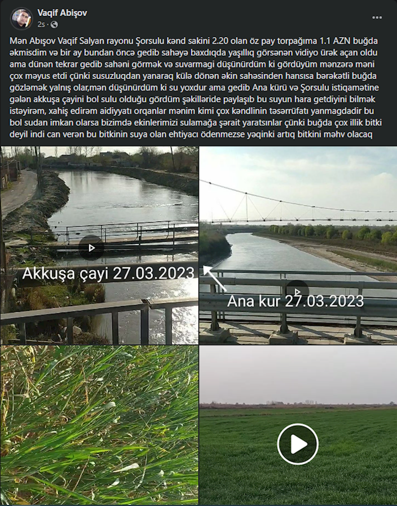 “Öz pay torpağıma buğda əkmişdim və bir ay bundan öncə gedib sahəyə baxdıqda ürək açan yaşıllıqla qarşılaşmışdım. Amma ötən gün (27 mart – red.) gedib sahəni görmək və suvarmağı düşünürdüm ki, gördüyüm mənzərə məni çox məyus etdi. Çünki susuzluqdan yanaraq külə dönən əkin sahəsindən hansısa bərəkətli buğda gözləmək yanlış olar. Mən düşünürdüm ki, su yoxdur. Amma gedib Kürün və Şorsulu istiqamətinə gələn Akkuşa çayının bolsulu olduğunu gördüm. Bu suyun hara getdiyini bilmək istəyirəm. Xahiş edirəm, mənim kimi bir çox kəndlinin təsərrüfatı yanmaqdadır. Aidiyyəti orqanlar imkan olarsa, bu bol sudan bizim də əkinlərimizi sulamağımıza şərait yaratsınlar”, - paylaşımda bildirilib.