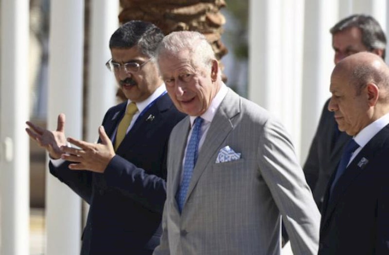 Böyük Britaniya kralı III Çarlz BMT-nin Dubayda keçirilən iqlimlə bağlı “COP28” konfransında Yunanıstan bayrağının rənglərinə və simvollarına bənzəyən mavi və ağ rəngli qalstuk taxıb.