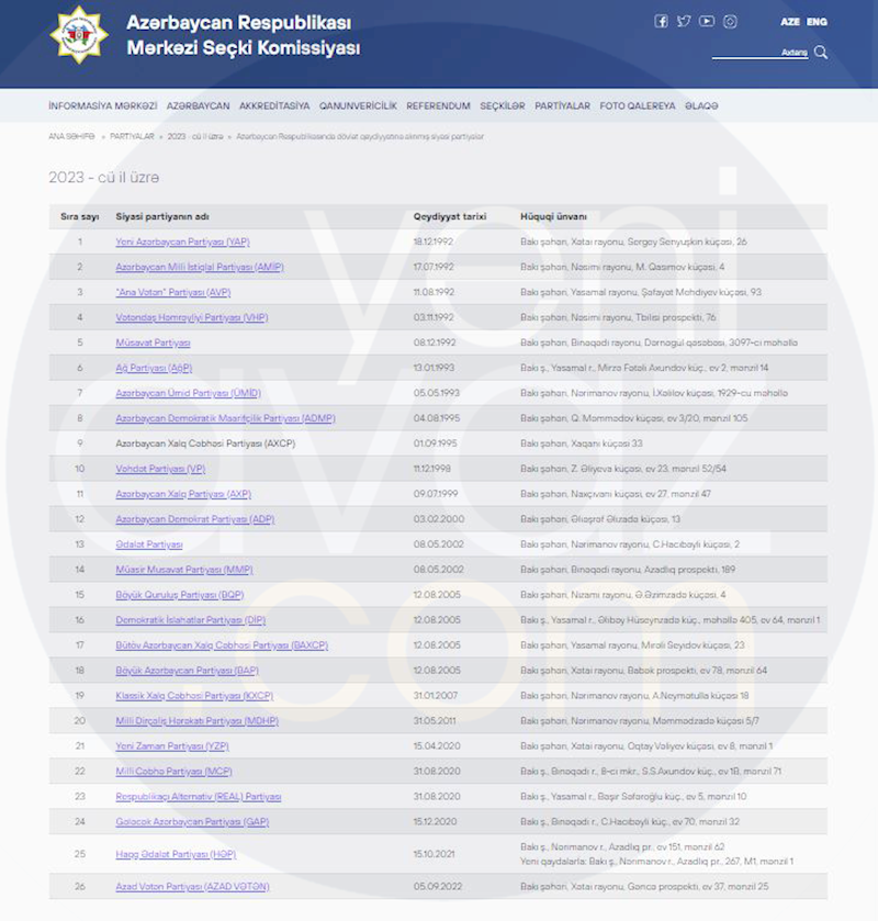 Məlumat üçün bildirək ki, siyasi partiyaların siyahısı hər il Mərkəzi Seçki Komissiyasının (MSK) rəsmi saytında yerləşdirilir. MSK-nın saytında yerləşdirilən siyahıda hakim Yeni Azərbaycan Partiyası (YAP) istisna olmaqla digər partiyaların sıralaması onların dövlət qeydiyyatına alındığı tarixə görə müəyyən olunub. Bu səbəbdən YAP-ın hansı səbəbdən siyahıdakı sıralamada 1-ci sırada yer aldığı aydın olmur. MSK-nın açıqladığı siyahıda siyasi partiyalar dövlət qeydiyyatına alınma tarixinə görə sıralandığı üçün YAP hazırkı siyahıda 5-ci sırda yer almalıdır.