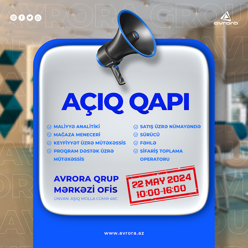 Açıq qapı zamanı vakansiyalar üzrə müraciətlər qəbul edilərək müsahibələr keçiriləcəkdir. Əgər siz də “Avrora Qrup” komandasının üzvü olmaq istəyirsinizsə, o zaman bu fürsətdən yararlana bilərsiniz. Maraqlanan şəxslərin “Avrora Qrup” baş ofisinə yaxınlaşması xahiş olunur.