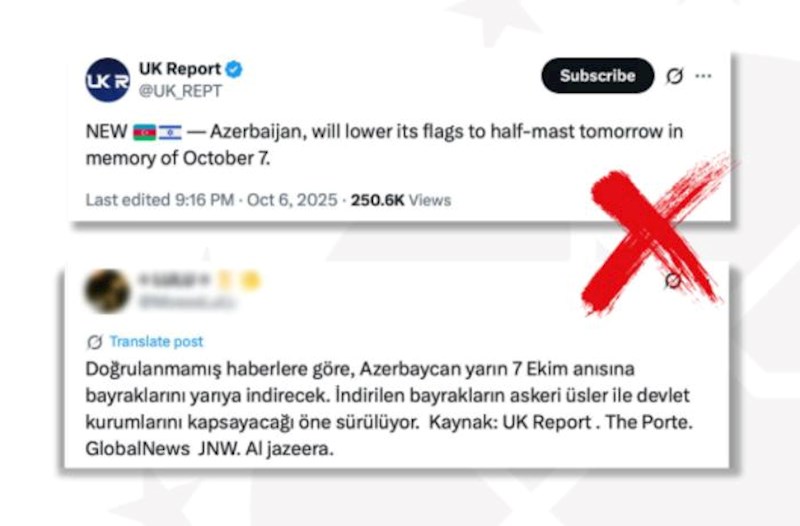 Bəzi sosial media hesablarında yayılan İsrailin 7 oktyabrda Qəzzaya qarşı başlatdığı hərbi əməliyyatların ildönümündə Azərbaycanda bayraqların yarıya endirilməsi ilə bağlı iddialar dezinformasiya xarakteri daşıyır.