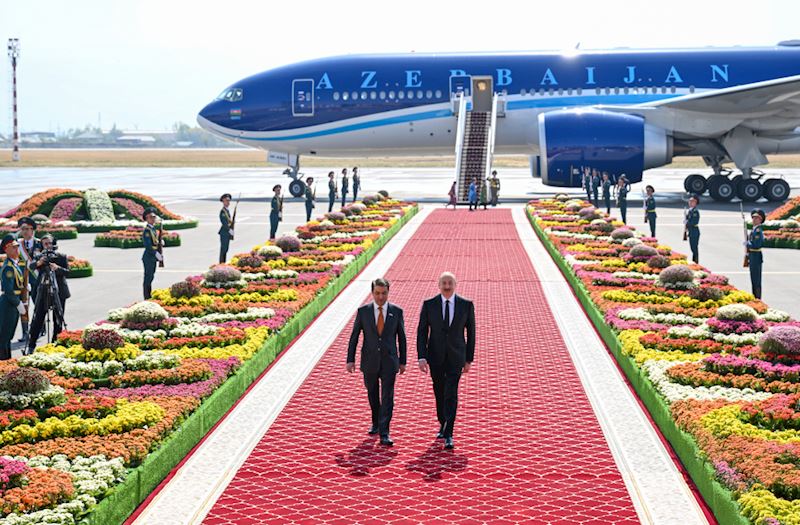 Yeniavaz.com xəbər verir ki, Düşənbə Beynəlxalq Aeroportunda dövlət başçısının şərəfinə fəxri qarovul dəstəsi düzülüb.
