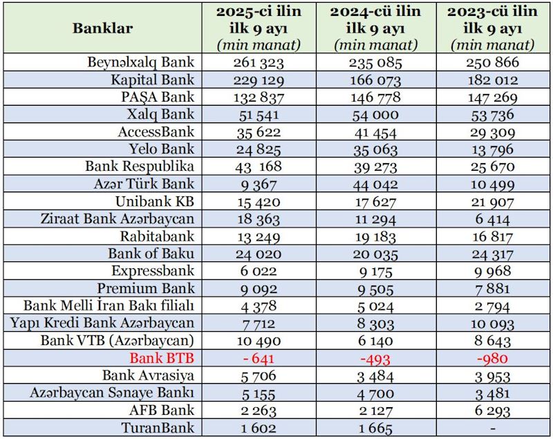 Banklar arasında yeganə zərər edən maliyyə qurumu isə “Bank BTB” ASC olub. Bu bankın son 9 aydakı xalis zərəri 641 min manat təşkil edib.
