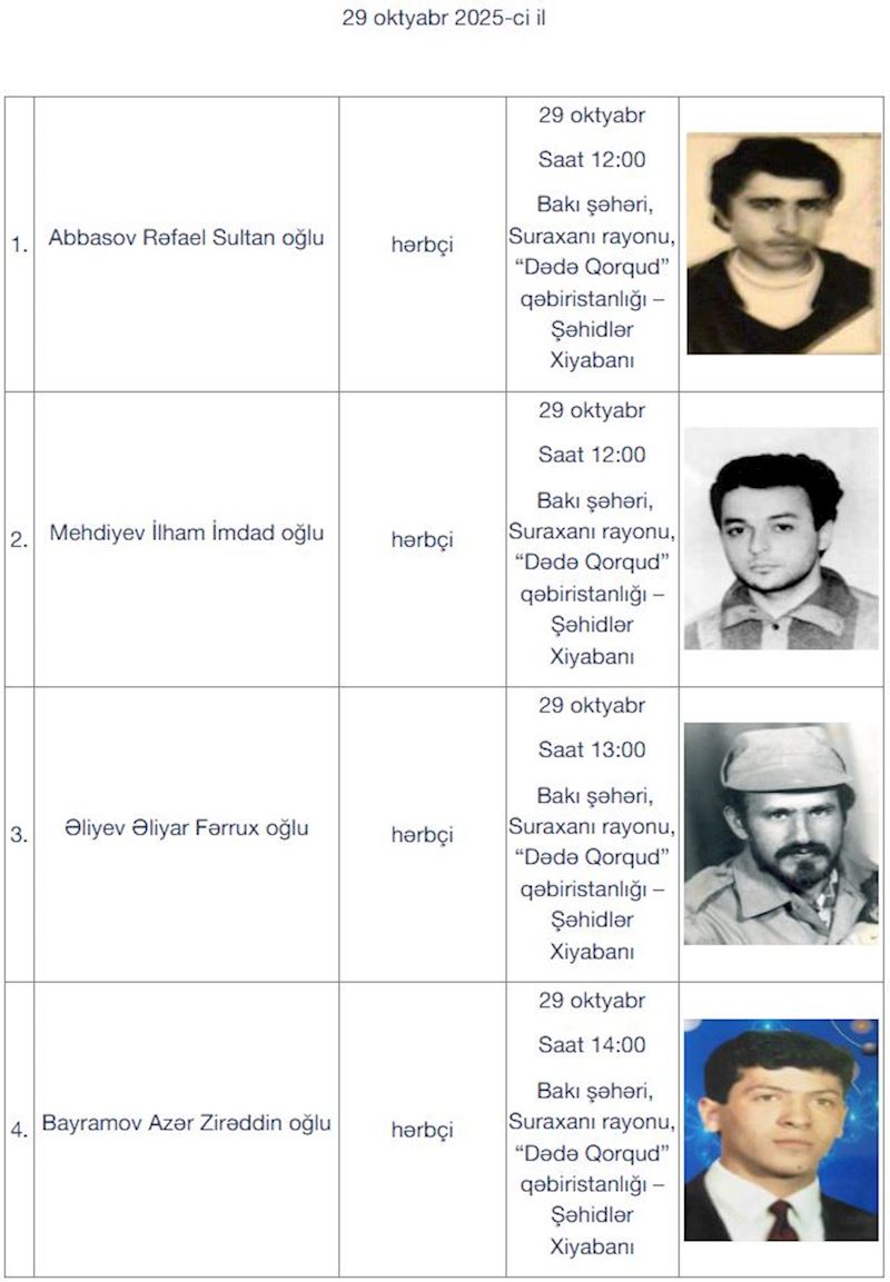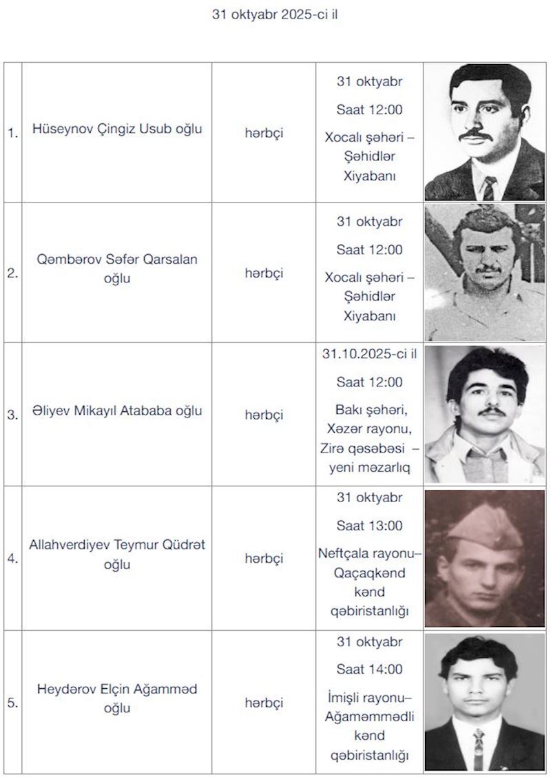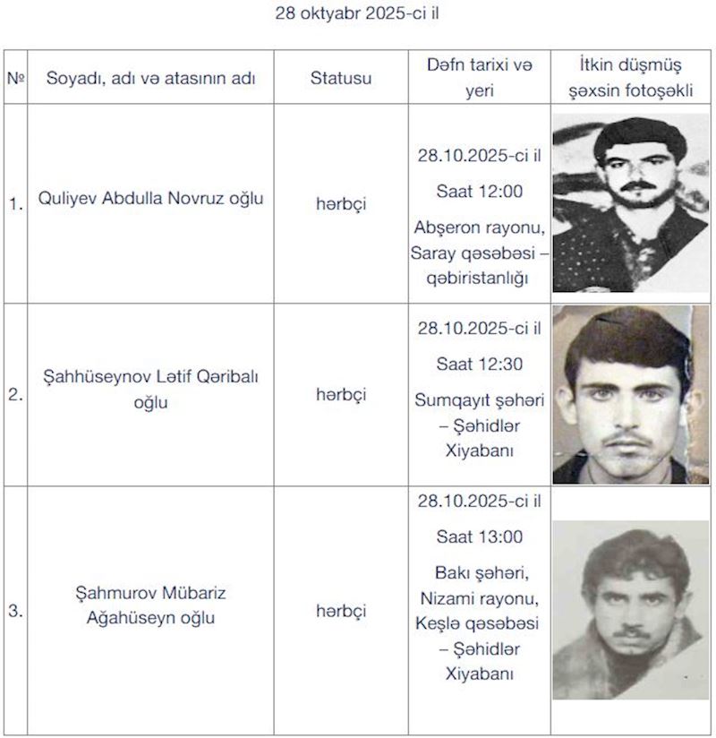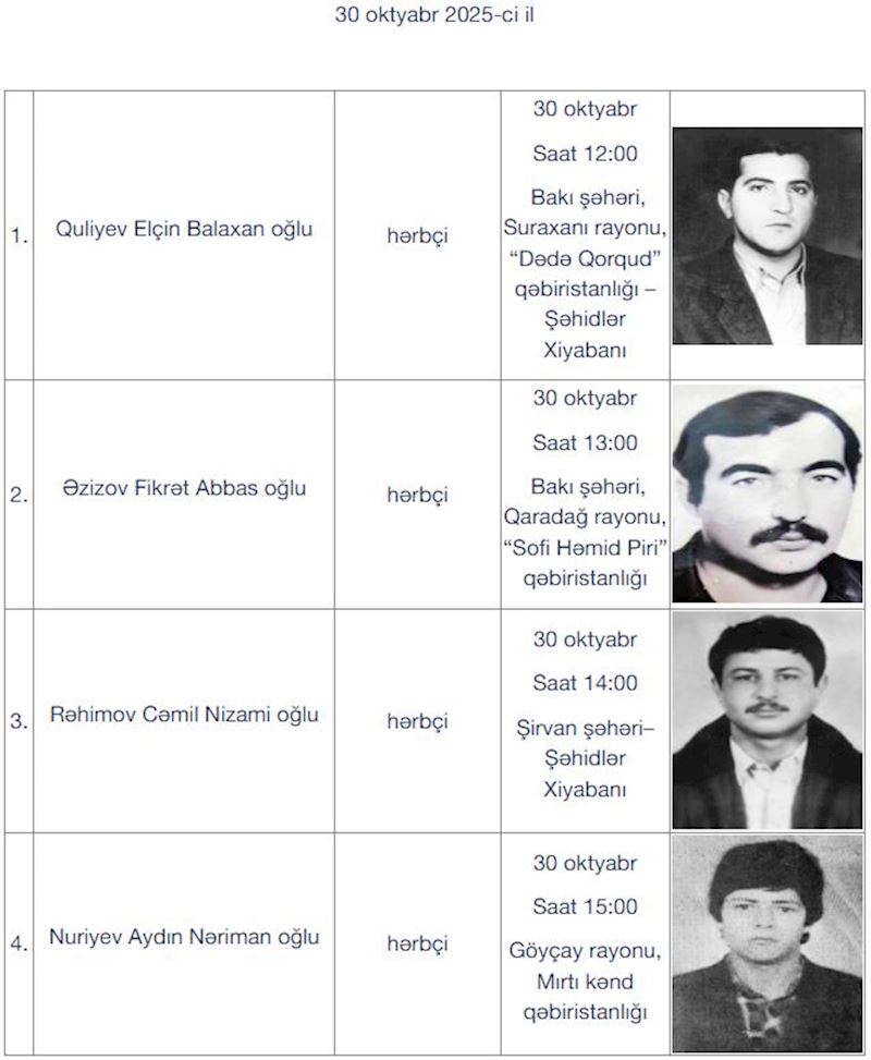 Bildirilib ki, hamısı hərbçi olan itkin-şəhidlər oktyabrın 28-i, 29-u, 30-u və 31-də Bakı və regionlarda dəfn olunacaqlar.