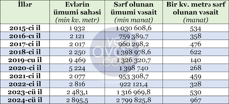 Cədvəldə son 10 ildə Azərbaycanda tikilən yaşayış evlərinin ümumi sahəsi, sərf olunan ümumi vəsait və yaşayış evlərinin bir kv. metrinin tikintisinə sərf olunan vəsait göstərilib: