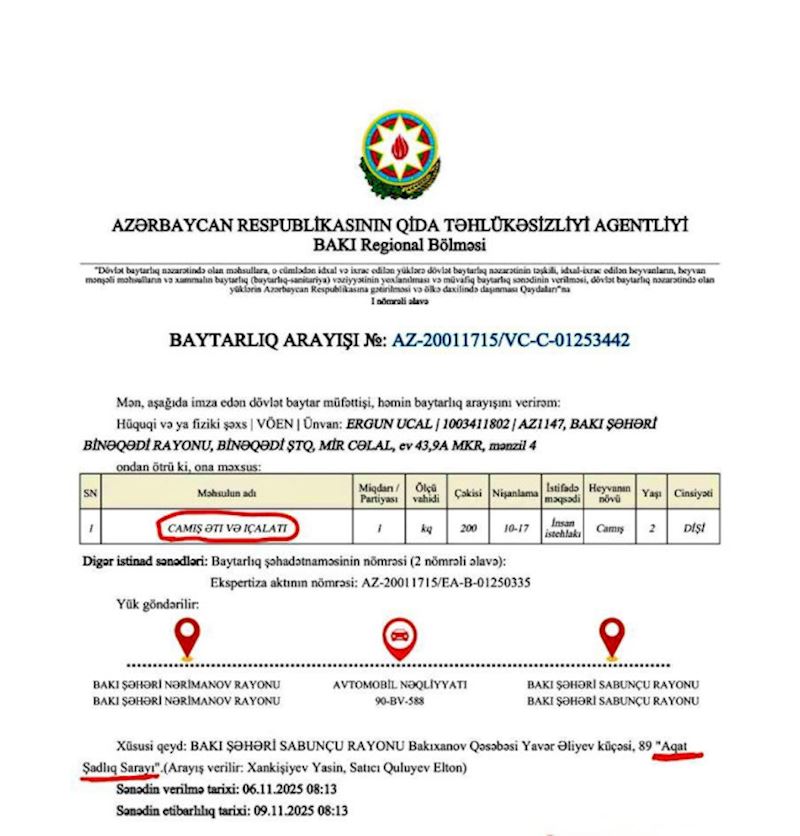 Yeniavaz.com Agentliyin yaydığı məlumata istinadla xəbər verir ki, yoxlama zamanı şadlıq sarayında qonaqların istehlakına dana əti adı ilə təqdim olunan ətin müvafiq baytarlıq sənədi ilə təmin edilən camış əti olduğu, menyuda bununla bağlı hər hansı bir məlumat verilmədiyi müəyyən edilib.