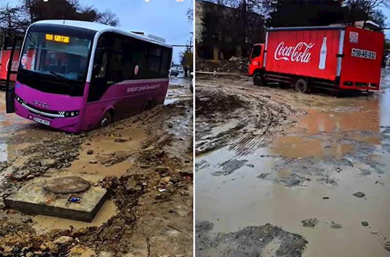 Sosial şəbəkələrdə palçıqda batmış avtobusun görüntüləri yayılıb.