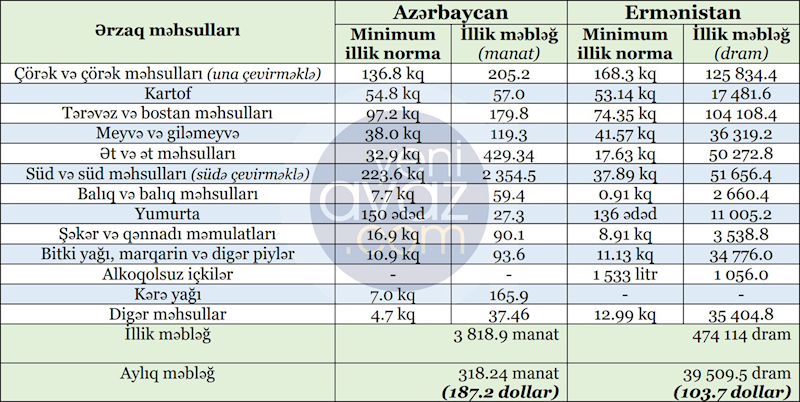 Müqayisə üçün bildirək ki, qonşu Ermənistanda minimum istehlak səbətində ərzaq məhsullarının aylıq dəyəri təxminən 104 dollar (39,5 min dram) təşkil edir.