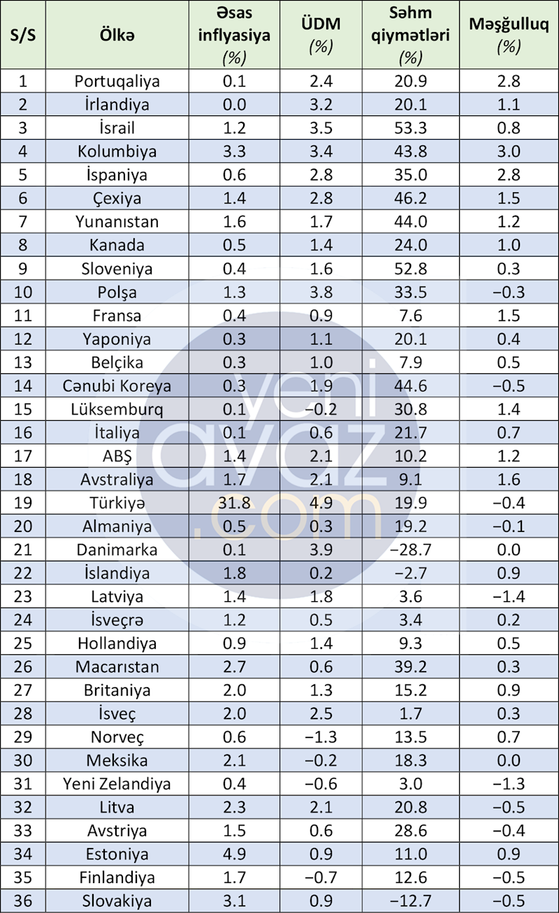 Reytinqə görə, 2025-ci ilin ən uğurlu iqtisadiyyatı Portuqaliya seçilib. Ölkə güclü ÜDM artımı, aşağı inflyasiya və canlanan fond bazarı ilə fərqlənib. Ötən il qalib olan İspaniya bu dəfə də liderlər sırasındadır. Vaxtilə iqtisadi çətinliklərlə üzləşən Yunanıstan da ilk onluqda yer alıb.