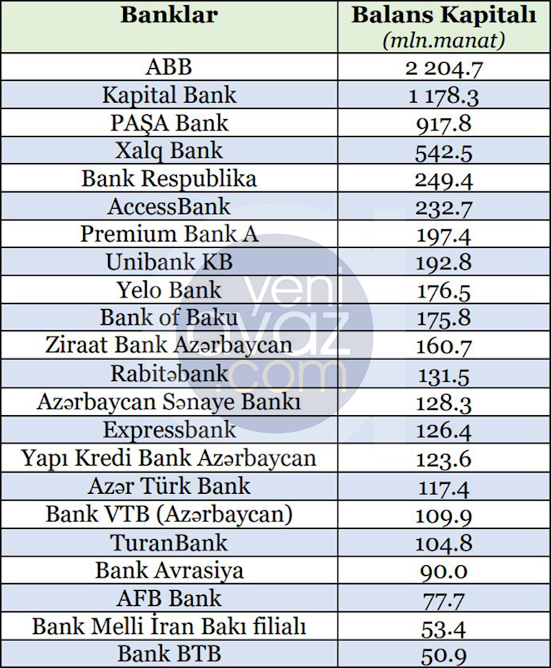 Yeniavaz.com xəbər verir ki, balans kapitalı 1 milyard manatdan çox olan 2 bank var. Bu banklar dövlət bankı olan “Azərbaycan Beynəlxalq Bankı” (ABB) və “Kapital Bank”dır.