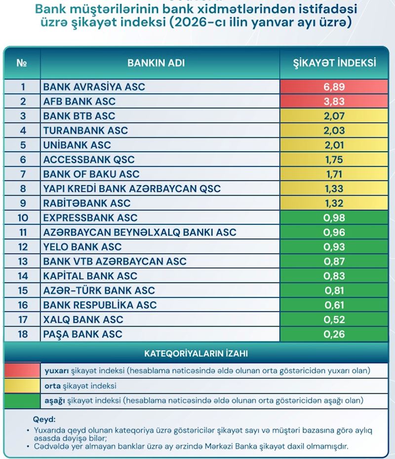 Yanvar ayında Azərbaycanda barəsində ən çox şikayət edilən bank “Bank Avrasiya” ASC olub.