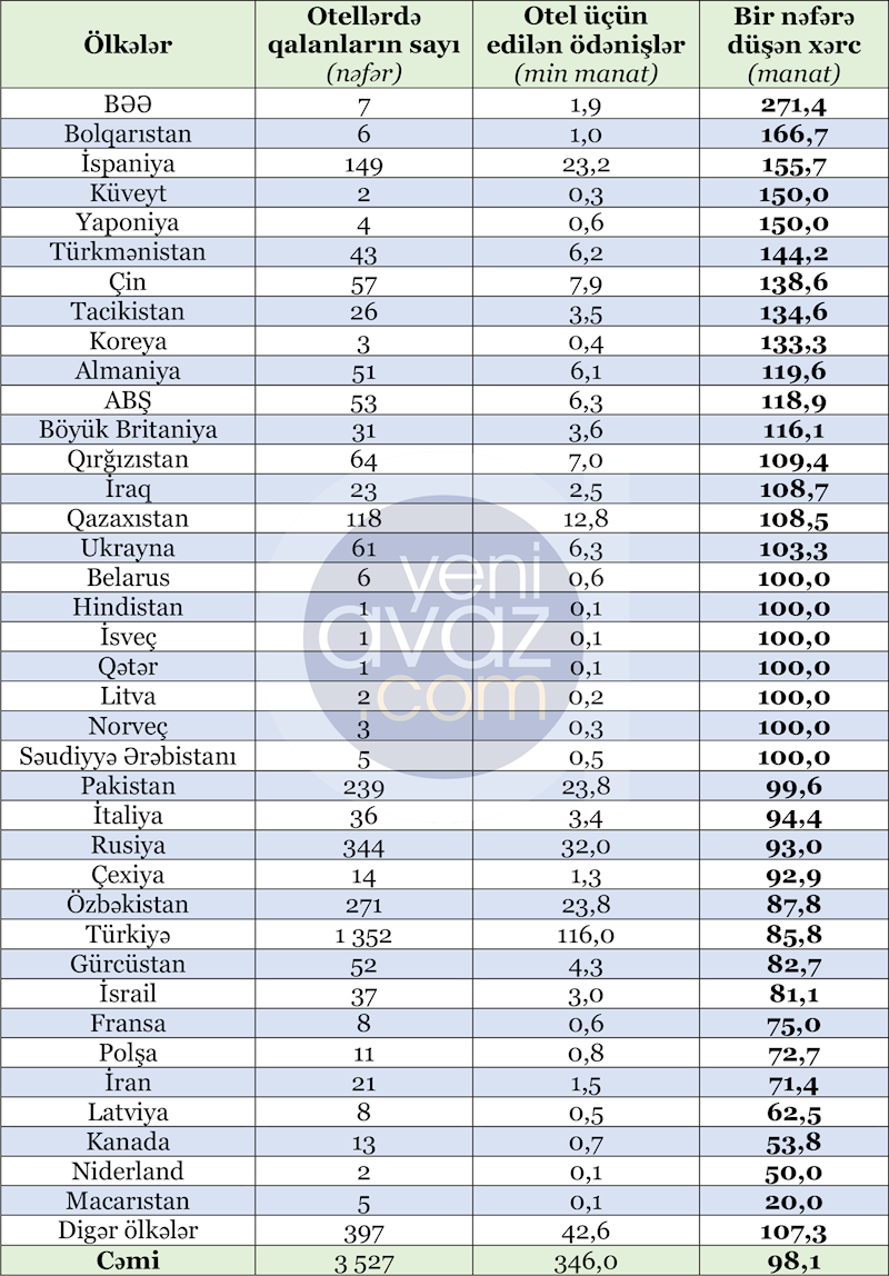 Yeniavaz.com açıqlanan rəsmi məlumatlara istinadən xəbər verir ki, əcnəbilər göstərilən xidmətlərə görə otellərə 346 min manat ödəyiblər.
