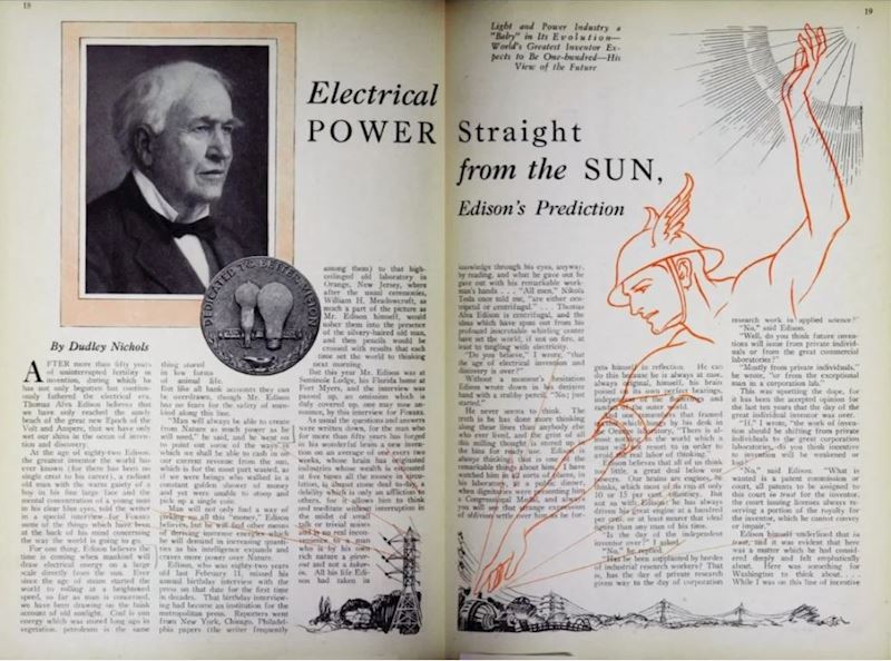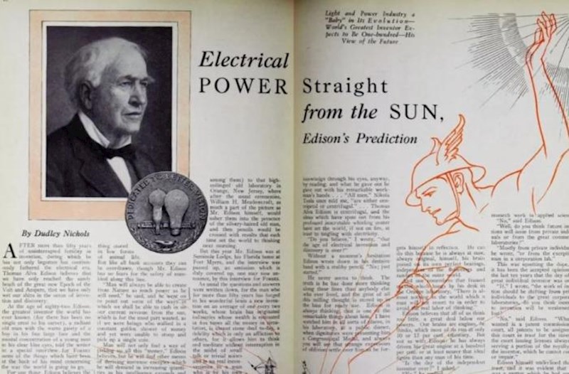 Məsələn, Edison əmin idi ki, bəşəriyyət günəşdən birbaşa elektrik enerjisi istehsal edə biləcək və bunu sənaye miqyasında həyata keçirəcək. Maşınları işlətmək üçün buxar enerjisindən istifadə etməyi öyrəndiyimiz vaxtdan bəri bəşəriyyət “qorunmuş” günəş enerjisi vasitəsilə toplanmış resurslarla yaşayır. Kömür fotosintez yolu ilə – yəni günəş enerjisinin udulması və emalı yolu ilə yaşayan bitkilərin qalıqlarından, neft isə günəş altında yaşamış canlı orqanizmlərin qalıqlarından əmələ gəlir. Təəssüf ki, gec-tez bütün resurslar tükənir, lakin Tomas Edison əmin idi ki, bəşəriyyət enerji çatışmazlığı ilə üzləşməyəcək.