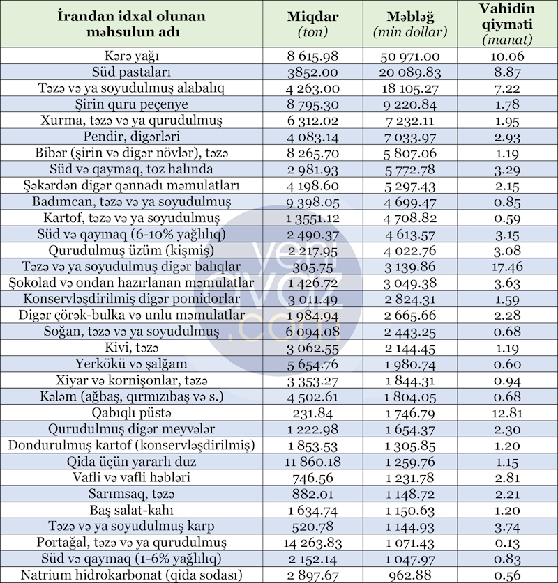 Cədvəldə ötən il Azərbaycanın İrandan idxal etdiyi əsas ərzaq məhsullarının bəziləri qeyd olunub: