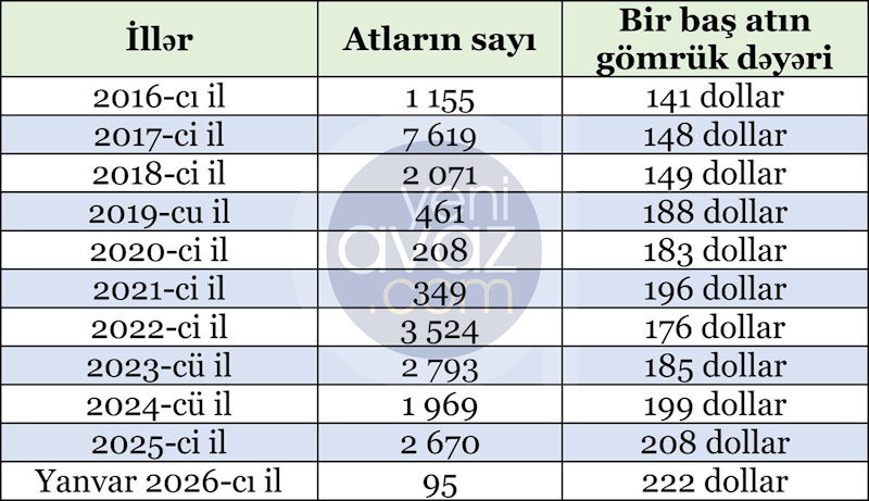 Açıqlanan məlumatlardan da göründüyü kimi, ötən ilin yanvar ayı ilə müqayisədə bu ilin yanvar ayında diri at ixracı 10 dəfədən çox artıb.