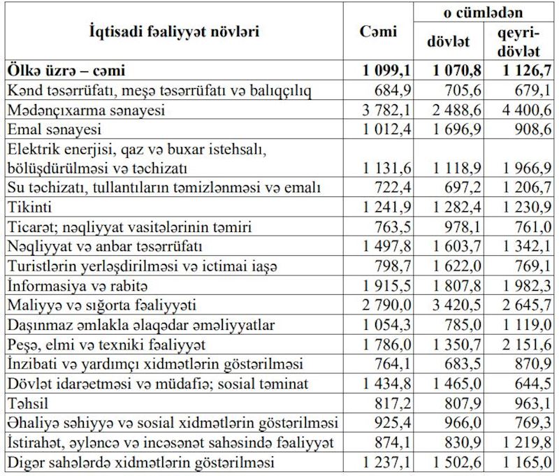 Yeniavaz.com açıqlanan rəsmi məlumatlara istinadən xəbər verir ki, əməkhaqqı neft-qaz sektorunda 4006,8 manat, qeyri neft-qaz sektorunda 1046,5 manat təşkil edib. Dövlət müəssisələrində çalışan işçilərin əməkhaqları 1070,8 manat, özəl müəssisələrdə isə 1 126,7 manat olub.