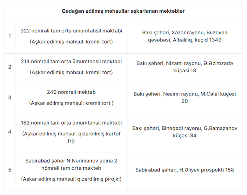 “Eyni zamanda 23 məktəbdə yararlılıq müddəti bitmiş, 5 məktəbdə isə bufetdə satılması qadağan edilən məhsullar aşkarlanıb. Yararlılıq müddəti bitmiş və satılması qadağan edilmiş məhsullar dərhal satışdan kənarlaşdırılıb. Aşkar olunmuş uyğunsuzluqlarla bağlı məsul şəxslər barəsində inzibati tədbir görülüb, icrası məcburi göstərişlər verilib. Eyni zamanda, məsələnin ciddi şəkildə nəzarətə götürülməsi üçün Elm və Təhsil Nazirliyinə və regional təhsil idarələrinə məktublar ünvanlanıb.