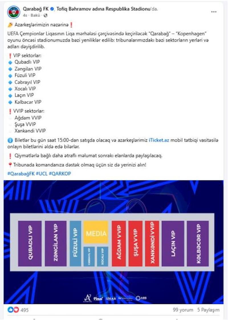 Кроме того, в предыдущей игре стоимость билета в сектора 29, 30, 37 и 38 составляла 50 манатов. На матче «Карабах» – «Копенгаген» стоимость билета в этих секторах была увеличена в 4 раза, достигнув 200 манатов. Были также изменены названия секторов: сектор 29 стал называться «VIP Губадлы», сектор 30 – «VIP Зангилан», сектор 37 – «VIP Лачин», а сектор 38 – «VIP Кельбаджар».