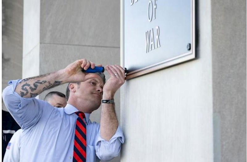 Pentaqonun binasındakı 70 ildən artıqdır ki qalan köhnəlmiş bürünc lövhələr “Müharibə Nazirliyi” yazılmış yeni lövhələrlə əvəz edilib.